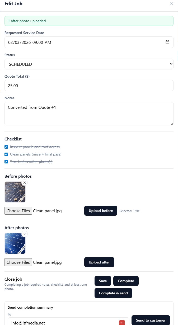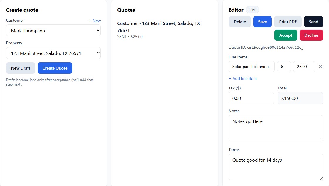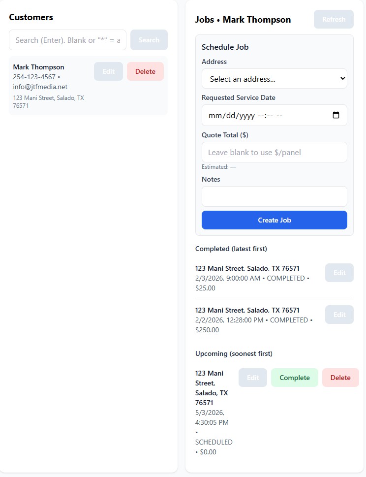 Quotes, scheduling, job closeout photos, and customer history. Built for crews, not corporate spreadsheets